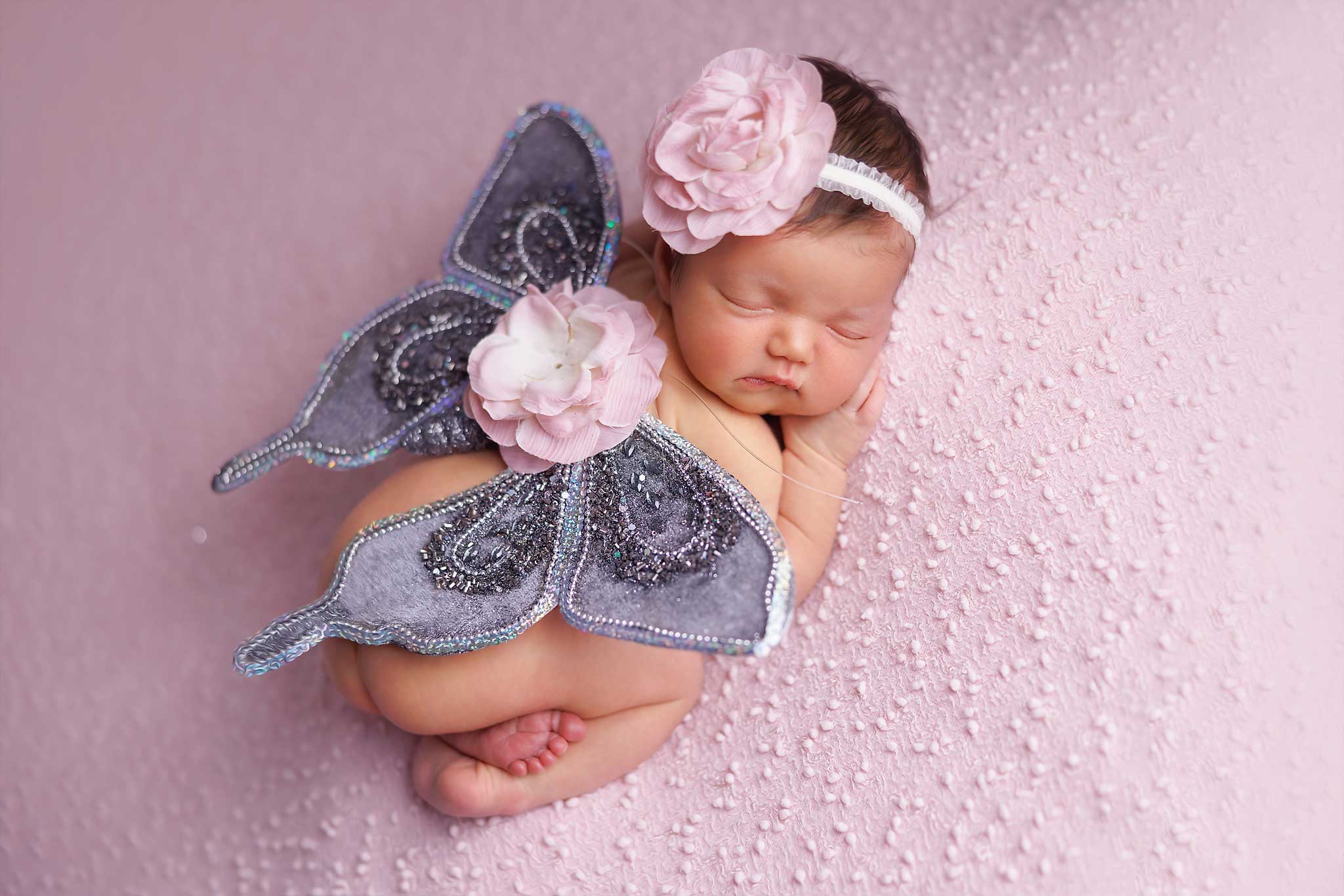 Whimsical newborn portrait of a baby girl in butterfly wings and floral headband – captured in Rahway, NJ.
