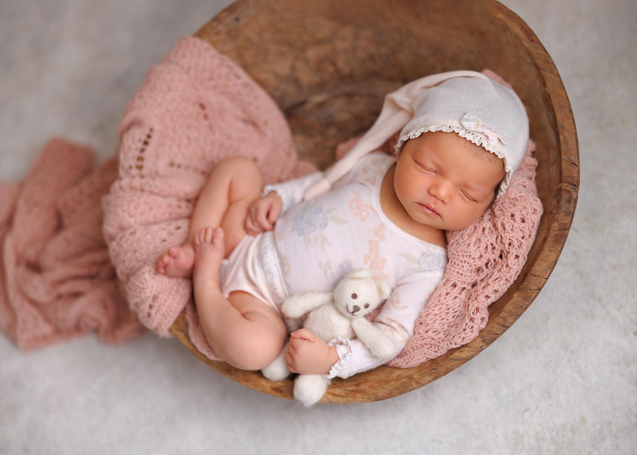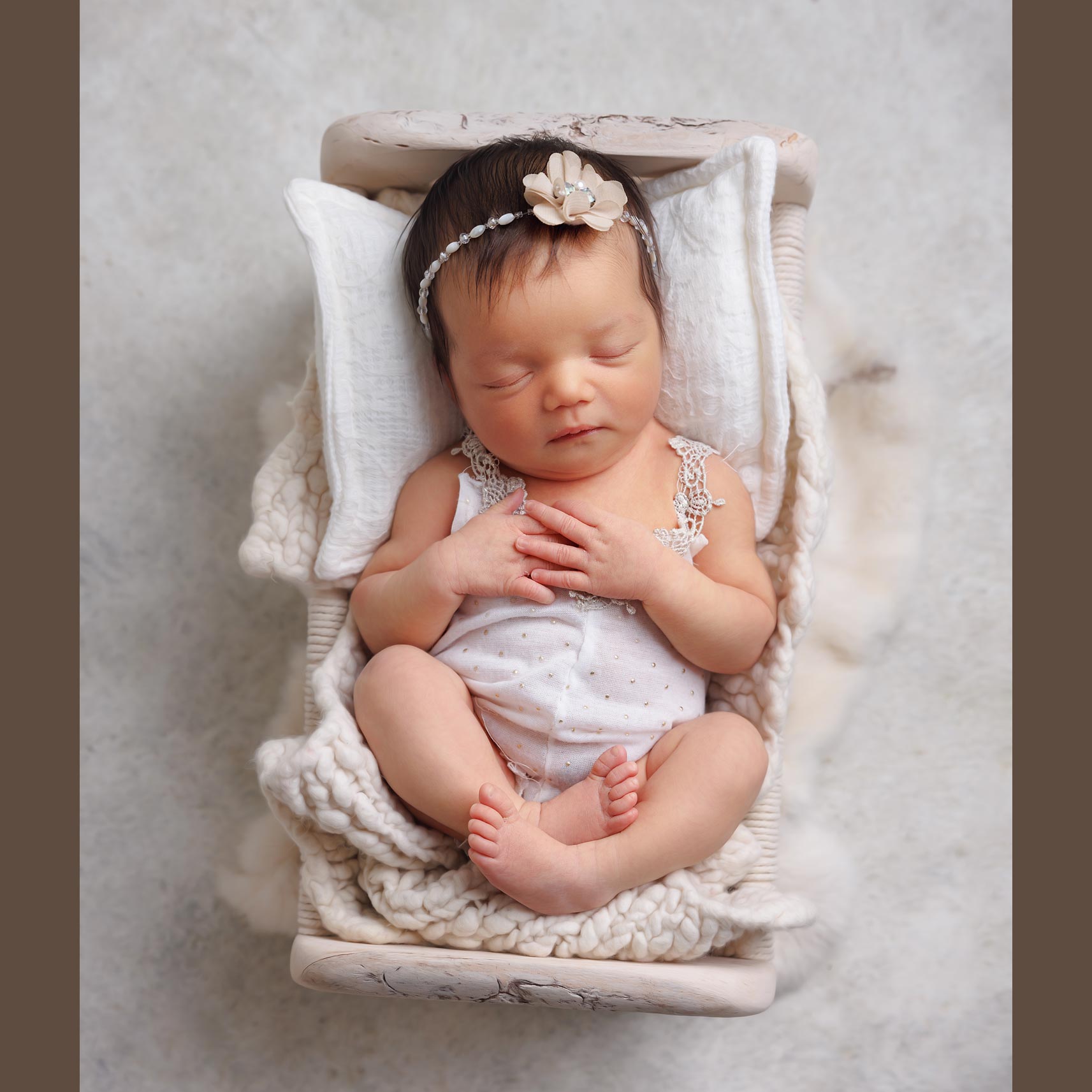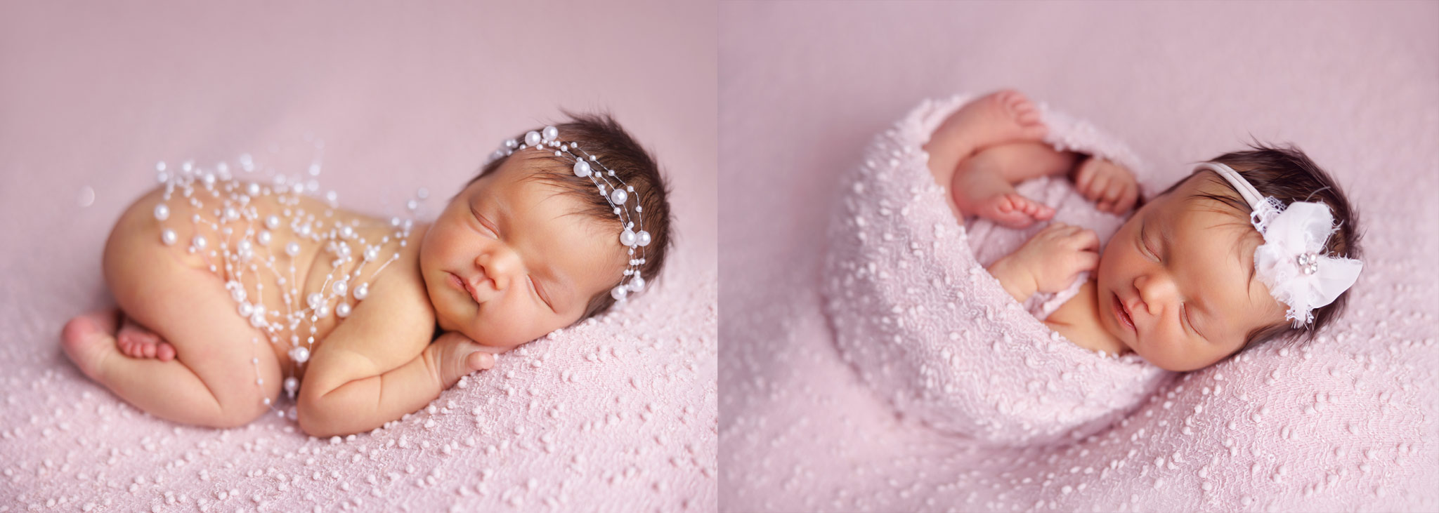 Artistic newborn portraits in Rahway, NJ – baby girl styled with pearl accents and delicate floral headband.