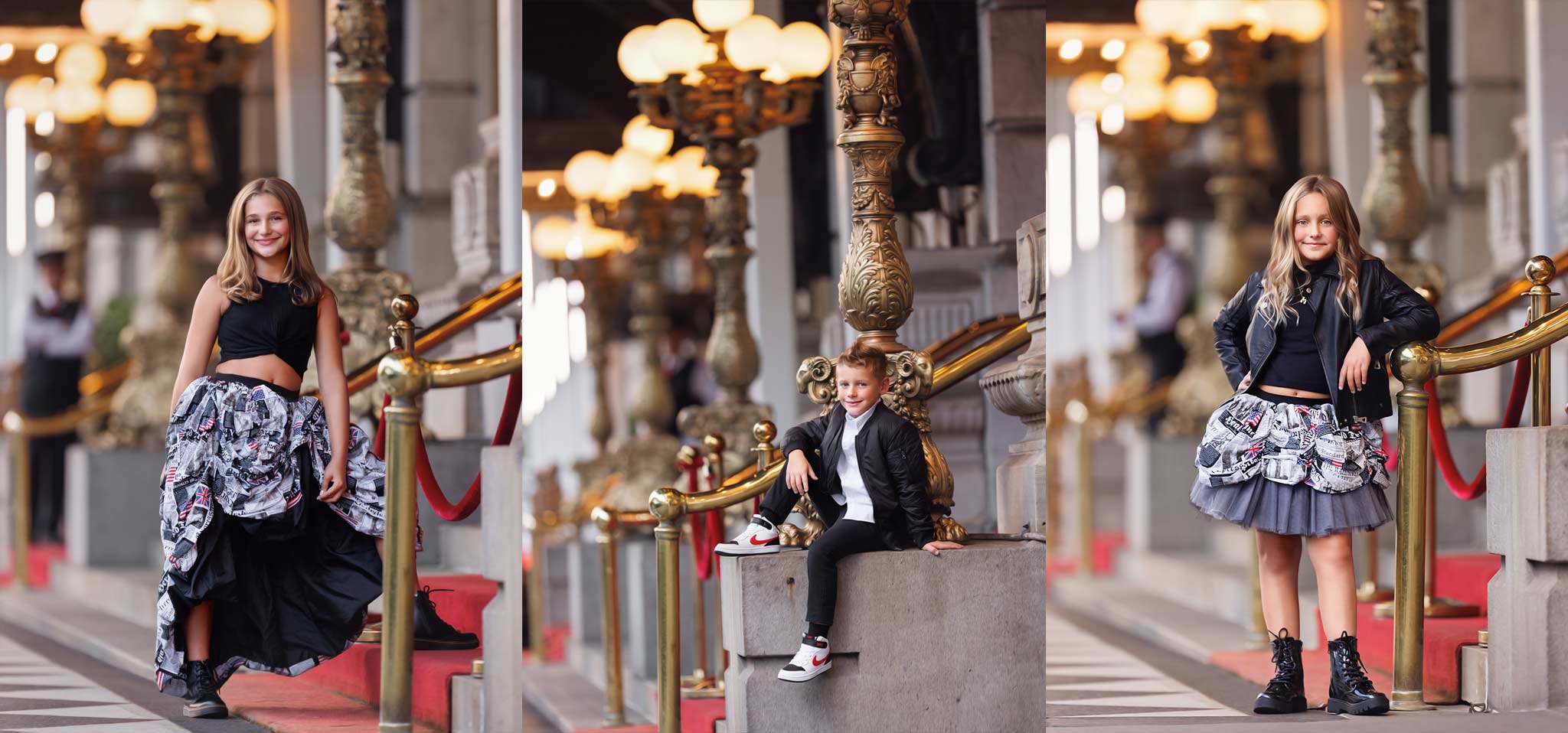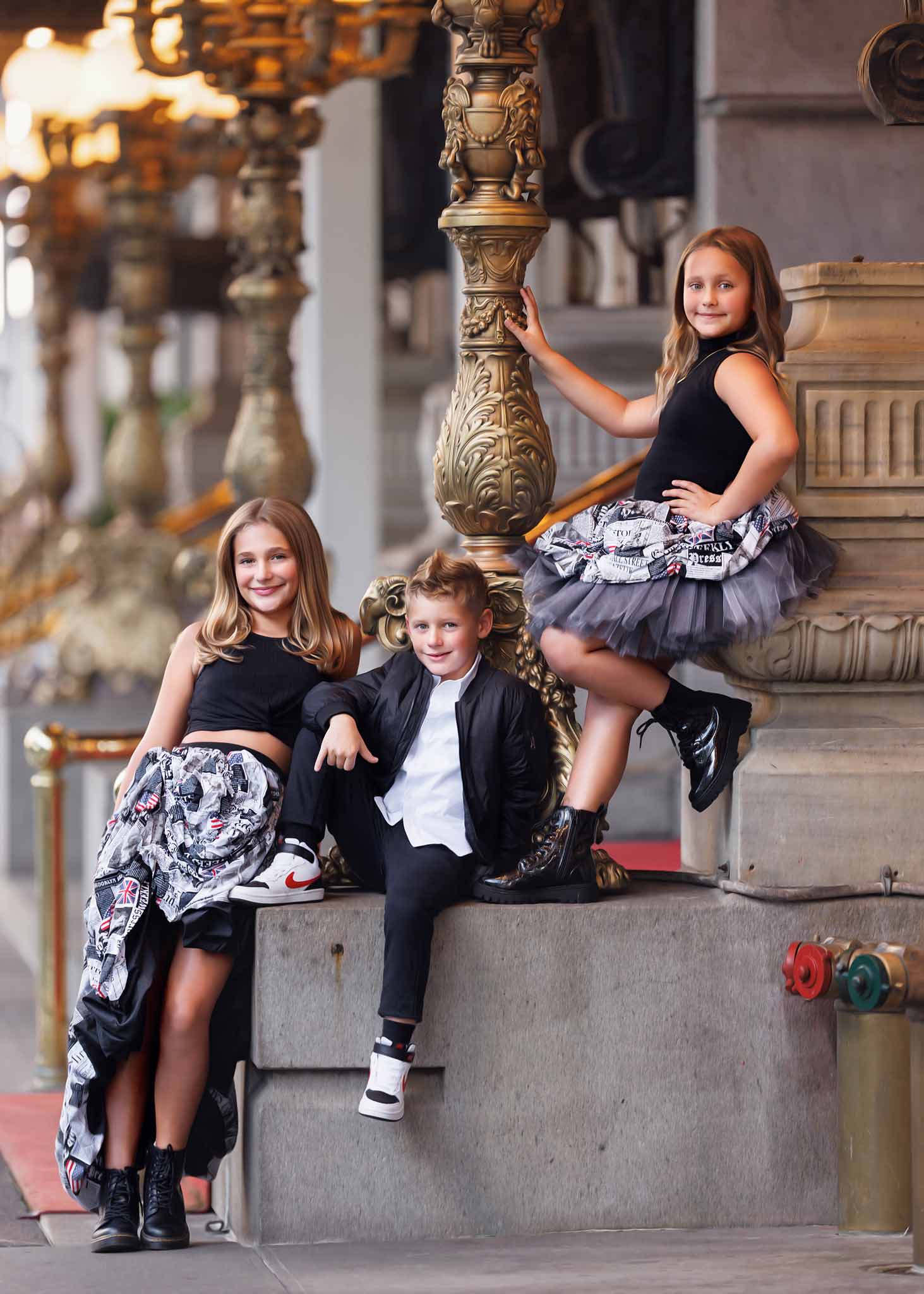 Fashion-forward sibling portrait captured outside The Ritz-Carlton New York, featuring coordinated black and patterned outfits during a modern family photography session.